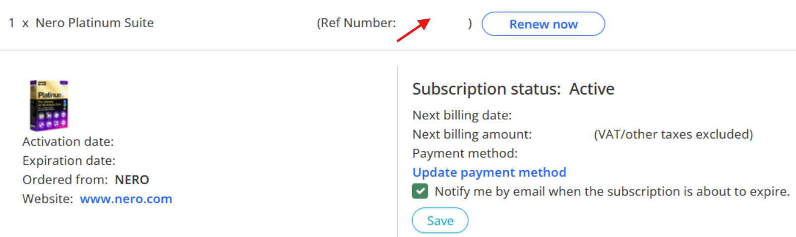 Nachdem Sie sich bei Nero myAccount angemeldet haben, klicken Sie auf „Referenznummer“.