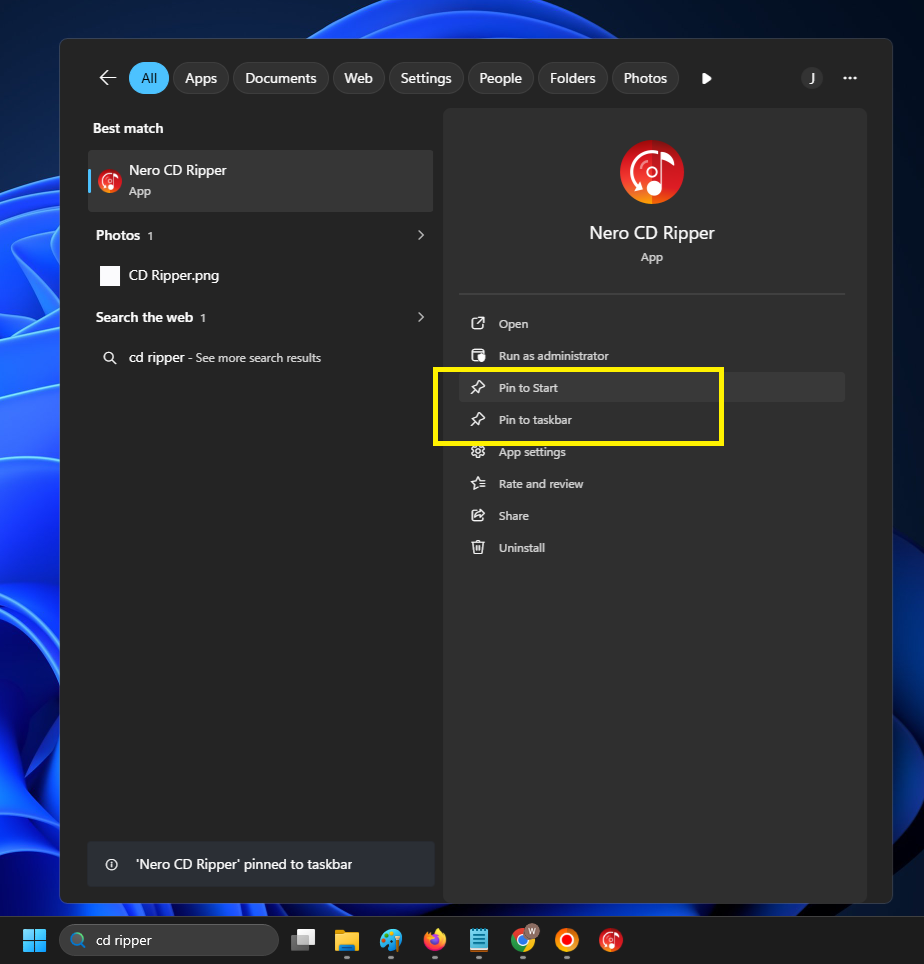 Find Nero CD Ripper in the Start menu and right-click it, then click the "Pin to Taskbar" or "Pin to Start" menu.