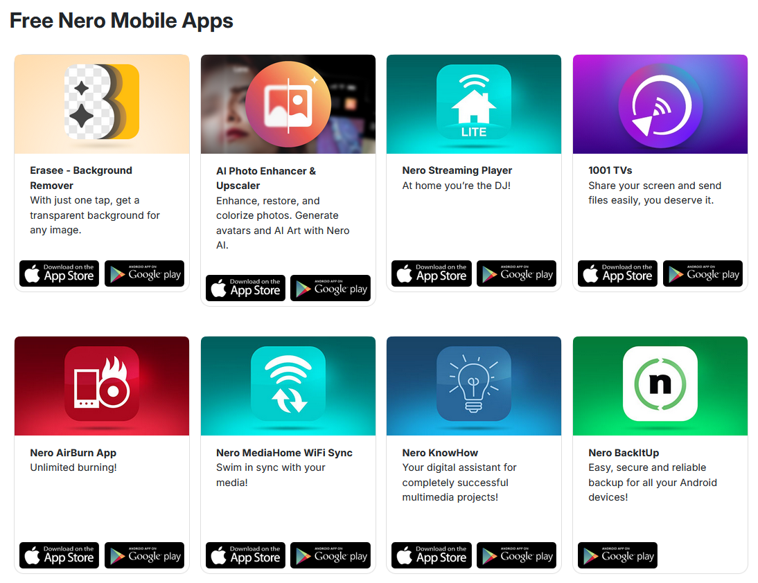 È possibile esplorare e scaricare queste app nell'App Store o dalla nostra pagina di download.https://www.nero.com/eng/downloads/?#d6
