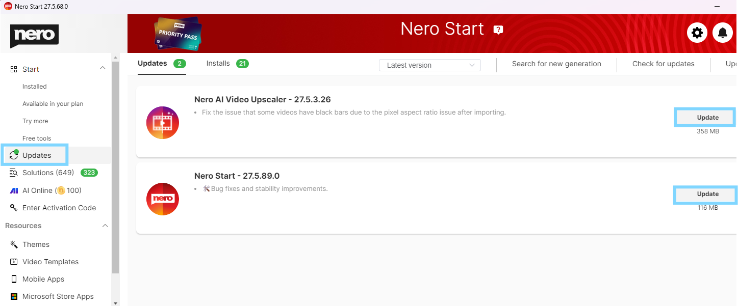 È possibile accedere a tutti gli aggiornamenti necessari tramite l'opzione “Aggiorna” nel riquadro sinistro di Nero Start. Basta aprire Nero Start, effettuare l'accesso e selezionare “Aggiorna” per installare l'ultima versione.