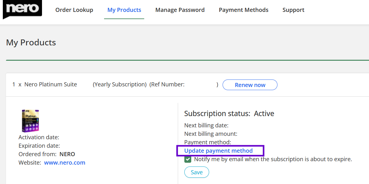1. Nero myAccountにログイン後、「支払い方法を更新」というリンクをクリックします。