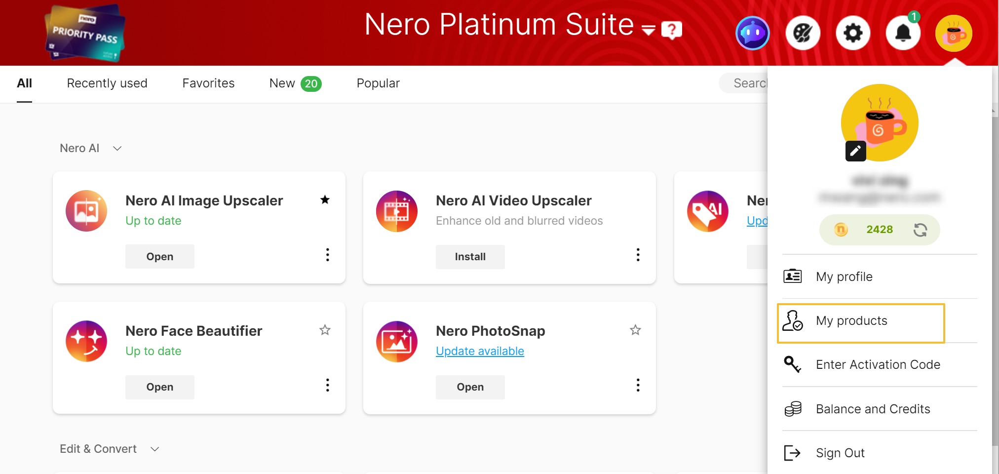 Jeśli na Twoim koncie Nero znajduje się wiele produktów (np. Nero Platinum 2025, Nero Platinum 2026 lub Nero Platinum Suite), Nero Platinum Suite jest zazwyczaj produktem domyślnym, a wszystkie aplikacje na ekranie startowym kierują do poszczególnych aplikacji w produkcie.