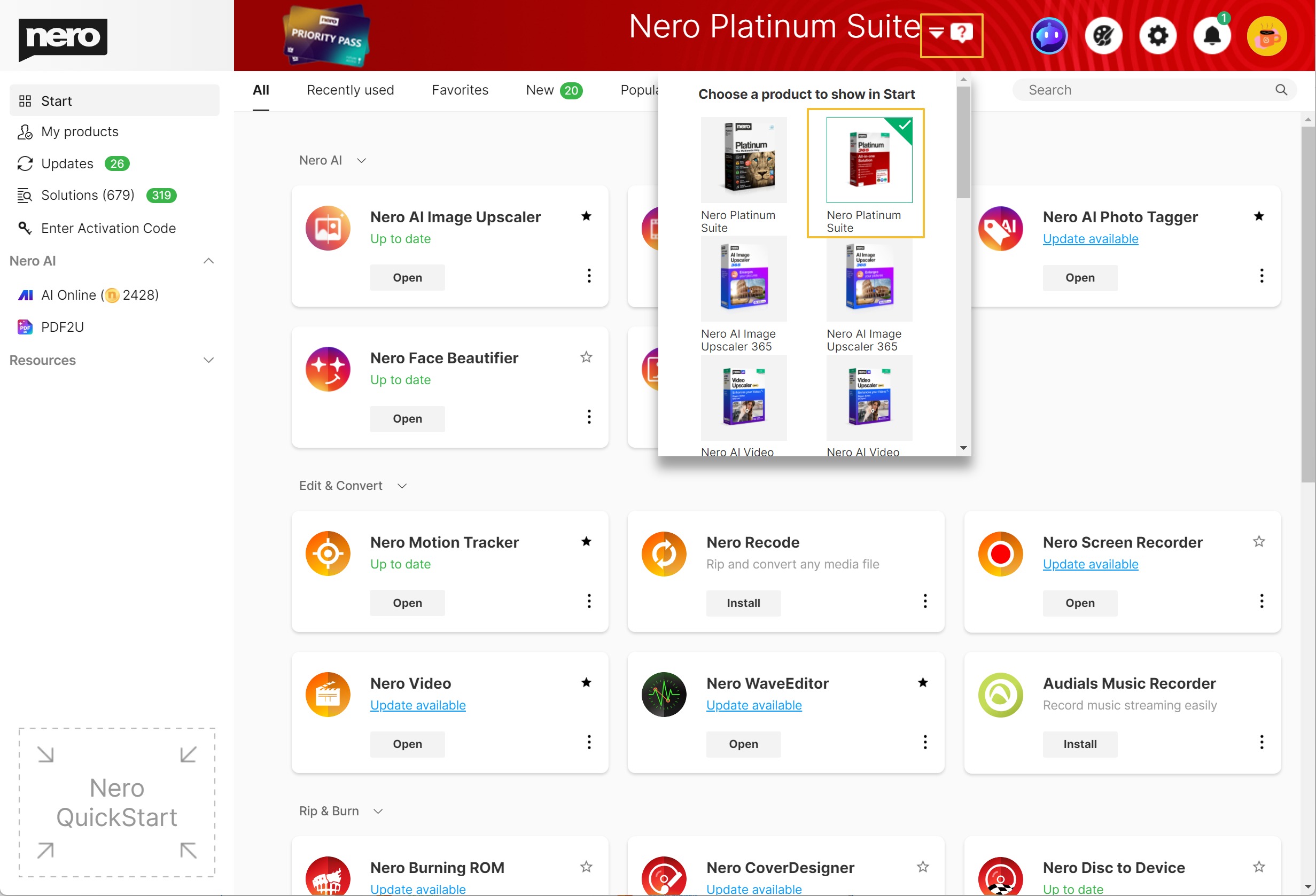 Po zmianie domyślnego produktu (np. z Nero Platinum na Nero Platinum 2026), wszystkie aplikacje będą widoczne na ekranie startowym i będą wskazywały aplikacje pakietu Nero Platinum Suite 2026. Co więcej, aktualizacje również będą dotyczyć danego produktu domyślnego.