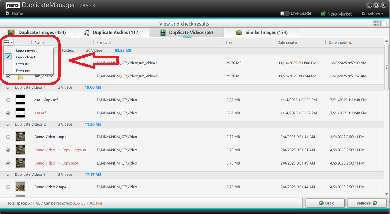 В Nero Duplicate Manager для перехода в режим просмотра в виде списка достаточно щелкнуть значок «Список». В этом режиме вы сможете выбрать, какие типы файлов сохранить, а какие удалить: